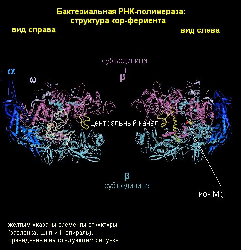 Разберем более подробно молекулярную структуру кор-фермента. Как было сказано выше, кор-фермент состоит из α- и β-субъединиц. Они соединены так, что образуют как бы «пасть» или «клешню». α-субъединицы находятся в основании этой «клешни», и выполняют структурную функцию. С ДНК и РНК они, по-видимому, не взаимодействуют. ω-субъединица – небольшой белок, который также выполняет структурную функцию. Основная часть работы приходится на долю β- и β΄-субъединиц. На рисунке β΄-субъединица показана наверху, а β-субъединица - внизу.