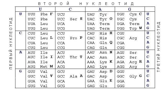 В таблице на рисунке боковые столбцы кодируют левую и правую букву кодона, верхняя строка – среднюю. Например кодон AUG кодирует аминокислоту метионин. Число комбинаций из 4 по 3 = 64, то есть некоторые аминокислоты кодируются несколькими кодонами. Три кодона не кодируют никакую аминокислоту, они называются терминирующими. Когда они попадаются в мРНК, рибосома прекращает свою работу и готовая полипептидная цепь выбрасывается наружу.