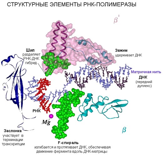 В транслокации, то есть перемещении РНК-полимеразы по нити ДНК, участвует α-спиральная структура, снизу вверх торчащая из β-субъединицы.