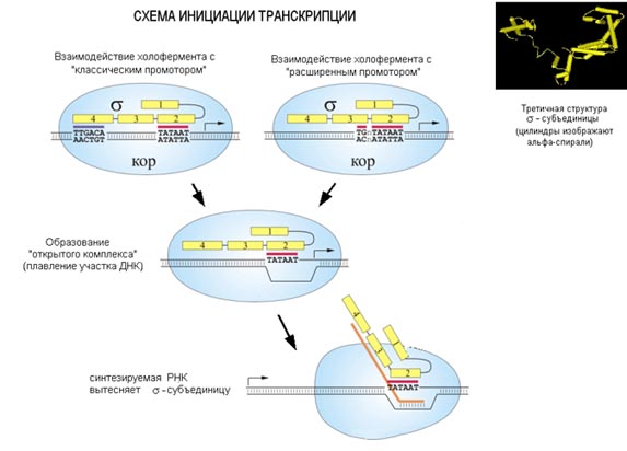Эта структура называется расширенным промотором. σ-субъединица РНК-полимеразы садится на промотор в ДНК и разными частями белковой молекулы взаимодействует с частями промотора. Распознает его σ-субъединица через большую бороздку ДНК. После того, как σ-субъединица в составе кор-фермента связалась с промотором, ДНК на этом участке начинает плавиться (расплетаются нити ДНК). На прошлой лекции обсуждалось, что в паре А-Т связи между нуклеотидами разрываются легче, чем в паре Г-Ц, так как последняя содержит 3 водородных связи, а первая – две. Промотор содержит пары А-Т, поэтому плавится он достаточно легко. И затем начинается синтез РНК, растущая цепь РНК выталкивает σ-субъединицу и происходят еще другие изменения, которые вызывают диссоциацию σ-субъединицы от кор-фермента.