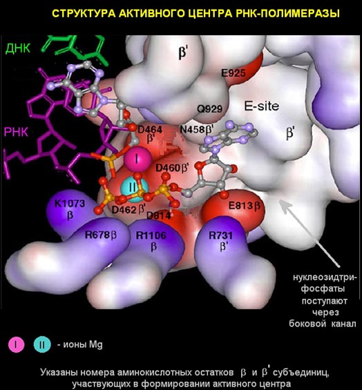 внутри "пасти" находится активный центр РНК-полимеразы, то есть то место, где непосредственно происходит комплементарное взаимодействие поступившего по боковому каналу рибонуклеоиздтрифосфата с ДНК-матрицей. Если вновь прибывший нуклеотид комплементарен матрице, то он ферментативно пришивается к свободному 3' –концу РНК. По характеру реакция образования новой связи в РНК относится к реакциям нуклеофильного замещения. В ней участвуют два иона магния. Один ион постоянно находится в активном центре, а второй ион магния поступает с нуклеотидом и после образования новой связи между рибонуклеотидами уходит, затем поступает новый нуклеотид со своим новым ионом магния.