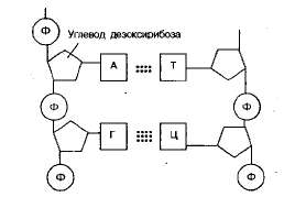 Рис 1.2. Фрагмент молекулы ДНК (между А—Т— две водородные связи; между Г—Ц — три водородные связи).
