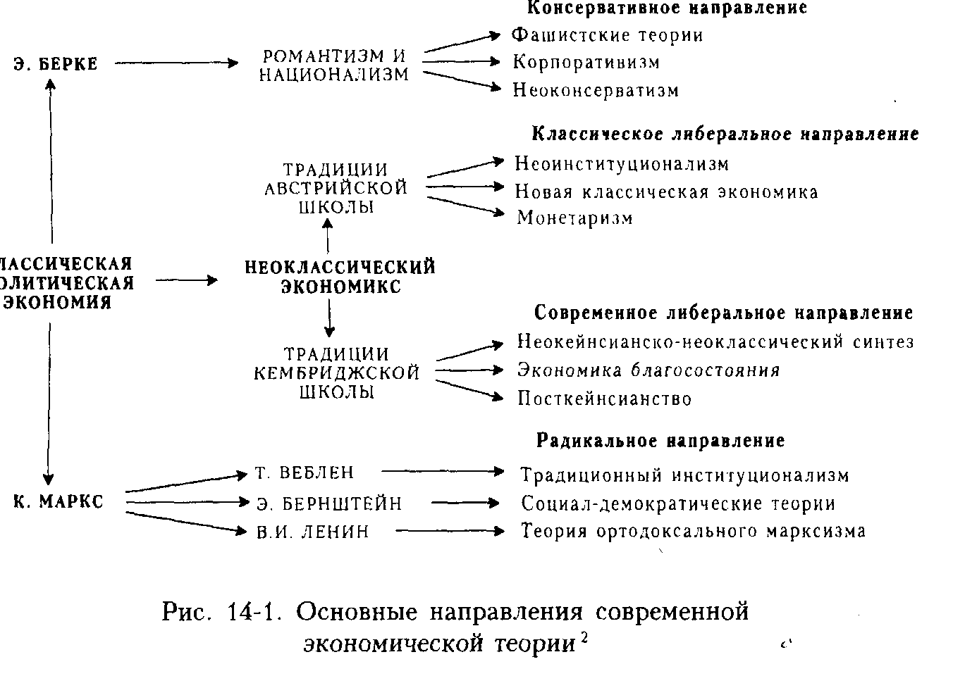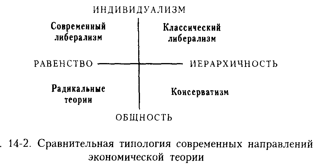 Палитру современных подходов хорошо отражает классификация, предложенная Б.Кларком (см. рис. 14-1). Она позволяет не только показать многообразие современных подходов, но и отметить точки их соприкосновения и взаимного перехода: от консервативного направления - через классический и современный либерализм - к радикальным течениям.