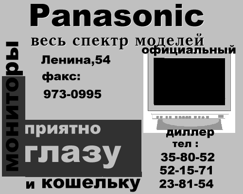 Panasonic - это часть компании Matsushita. В 1995 году он занимал 13 место в мире по продаже мониторов, а в 1997 году он уже судя по всему уверенно займёт 5 позицию. Но если разделить все мониторы на до 17 дюймов и больше 17, то в 1995 году эта фирма занимала 3 место по продаже больших мониторов, а в 1997 году ей прочат первое место. Мониторы этой фирмы отличает то, что они занимают меньше места, имеют систему растяжения пикселей, обладают удивительным свойством -их кинескопы абсолютно плоские и по горизонтали и по вертикали, способны поддерживать работу при разрешении до 1280 х 1024 при 80 Гц. У многих моделей полностью отсутствует изучение. И все эти свойства очень удачно сочетаются с невысокой для таких мониторов. Наличие большого количества сервисных центров с первоклассными специалистами, а так же разветвлённая сеть фирменных магазинов всегда рады вам оказать помощь или проконсультировать.