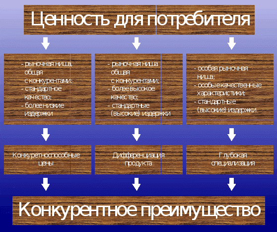Основной рабочий инструмент в реализации целевой функции предприятия - это его рыночная стратегия, в рамках которой реализуются конкурентные преимущества предприятия. Конкурентное преимущество - это то, что отличает данное конкретное предприятие от его конкурентов и обеспечивает устойчивое положение на рынке. Конкурентные преимущества связаны либо с качественными характеристиками товаров (услуг), либо с более низкими ценами на продукцию предприятия. В международной теории и практике бизнеса различают три основных вида рыночной стратегии предприятия, анализу которых посвятил свои исследования американский экономист Майкл Портер. Для того чтобы успешно осуществлять свою деятельность в условиях рыночной конкуренции, предприятия должны продавать товары или предоставлять услуги либо по более, низкой цене, чем их конкуренты (конкурентно-способные цены), либо с такими качественными характеристиками, которые ставят их вне конкуренции (дифференциация продукта); либо, придав им особые свойства, которые удовлетворяют потребности узкого круга потребителей (глубокая специализация) (рис.2).