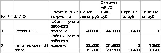 Следующим этапом является проверка табелей учета рабочего времени. Здесь установим, что случаев включения в них вымышленных (подставных) лиц нет, так как в нарядах и табелях учета рабочего времени фамилии совпадают с данными учета личного состава. Случаев повторного начисления сумм по ранее оплаченным первичным документам, повторения одних и тех лиц в нескольких расчетно-платежных ведомостях не обнаружено.