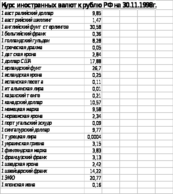 Для статистического анализа я выбрал курс американской валюты за ноябрь 1998 года (Таблица 2). Также проведем сопоставление других национальных валют с курсом доллара на 30.11.1998г. ( Таблица 3).