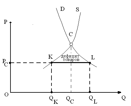 Равновесная цена, определяемая соотношением спроса и предложения в точке С, равна уровню PC. Государство устанавливает постоянные цены (PKL), при которых объем предложения товарной массы OQK, а объем спроса OQL.