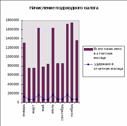Данная диаграмма показывает удержанные в течение года суммы подоходного налога. На графике видна зависимость начисленных сумм подоходного налога от начисленных доходов: чем выше полученный доход, тем больше сумма налога. Однако определенные доходы включаются в облагаемый доход не в полном размере (материальная помощь, стоимость подарков). Поэтому, например, в ноябре,когда была оказана материальная помощь, сумма налога незначительна, несмотря на высокий доход