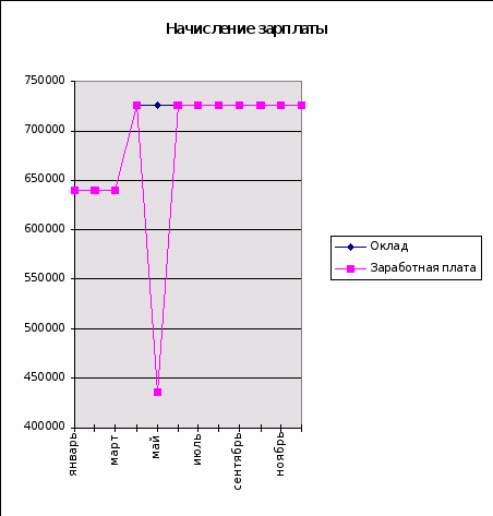 Данная диаграмма показывает начисление зарплаты по месяцам. При повременной форме оплаты труда размер заработной платы зависит от числа отработанных дней и установленного оклада. Это можно проследить на графике. С повышением оклада (в апреле месяце) растет и заработная плата. В мае зараплата не совпадает с окладом, т.к. в этом месяце работником фактически было отработано 12 дней из 20 рабочих.
