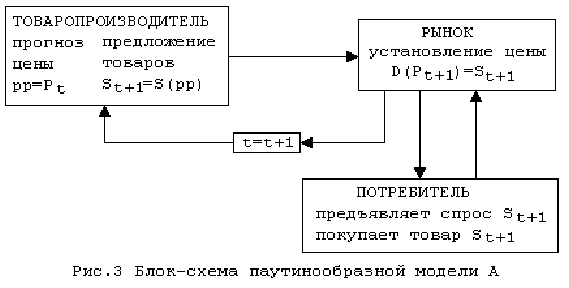 Модель можно представить в виде блок-схемы, изображенной на рис.8. Из этой блок-схемы видно, что в рассматриваемой модели происходит отставание предложения: S(P>t+1>)=D(P>t>).