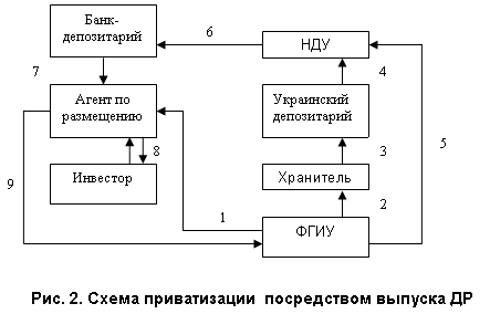ФГИУ и ГКЦБФР предложили использовать при приватизации усложненный вариант схемы, разработанной на основании Постановления КМУ № 1320 от 21.07.1999 г. (рис. 2). Первый шаг в схеме, предложенной ГКЦБФР,- это подписание договора между агентом по размещению и ФГИУ. После этого ФГИУ ищет хранителя (кастоди), на которого возлагаются функции обездвиживания ЦБ в соответствии с решением ГКЦПФР № 60 и № 61 от 26.05.1998 г. (2). Хранитель должен иметь счет в украинском депозитарии, который, в свою очередь, должен иметь счет в Национальном депозитарии Украины (НДУ), который открывает корсчет в банке-депозитарии, берущем на себя функцию эмитента ДР. Таким образом, по операциям (3)-(4) бумаги должны дойти до корсчета украинского депозитария в НДУ, после чего полномочия управлять счетом до перечисления средств переходят к ФГИУ (5). НДУ должен перевести бумаги на корсчет иностранного депозитария (6), после чего последний выпустит расписки (7). После реализации депозитарных расписок агентом по размещению (8) ФГИУ получает денежные средства.