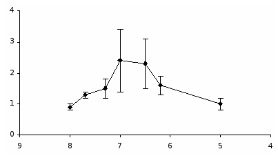 ось абсцисс – отрицательный десятичный логарифм концентрации серотонина в нормальном физиологическом растворе; ось ординат – отношение амплитуды мышечных сокращений в растворе серотонина к амплитуде мышечных сокращений в физиологическом растворе; вертикальные линии – стандартное отклонение (n = 5)