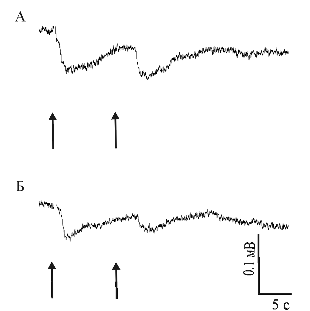 Рис. 1. ЭРГ нативного а и регенерировавшего б глаз содержавшихся на свету моллюсков A. Fulica в ответ на предъявление двух вспышек света с интервалом в 10 с. Стрелками обозначены моменты нанесения световой стимуляции