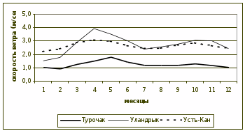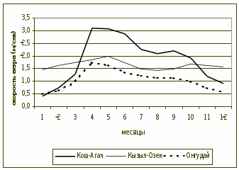 При этом годовые амплитуды изменения данного показателя для одних станций незначительны (до 0,5 м/сек), но для других это значение колеблется до 2,5 м/сек (Бертек, Горно-Алтайск, Кош-Агач).