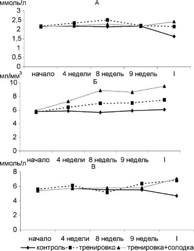 Содержание эритроцитов (рис. 1 Б) в крови в процессе тренировок возрастало, уровень глюкозы (рис. 1 В) снижался в период интенсивных мышечных нагрузок.