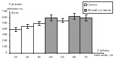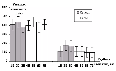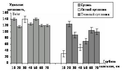 На глубине 70 см лёгкие суглинки накапливали равное или меньшее количество радионуклида, чем тяжелые, поэтому можно говорить о прямой зависимости распределения элемента от механического состава почвы.