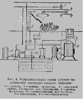 Стационарные установки воздушно-пенного тушения (рис. 8) применяют для защиты складов, производств, связанных с применением или переработкой нефти и нефтепродуктов, находящихся резервуарах, закалочных ваннах, технологических аппаратах и других хранилищах.