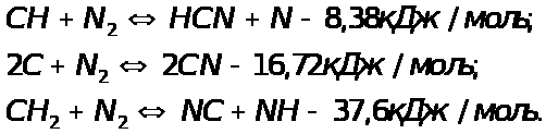 С. Фенимор на основание ряда реакций сделал предположение, что быстрое образование NO объясняется связыванием молекул азота радикалами СН и С2 в реакциях с очень малыми энергетическими затратами: