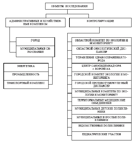 Рис.1. Объекты исследования геоэкологического мониторинга приземного слоя атмосферы и контролирующие органы медико-экологического мониторинга (использованы данные [1,2,10,15,17]).