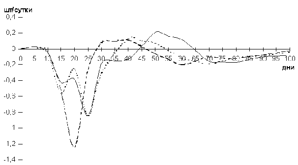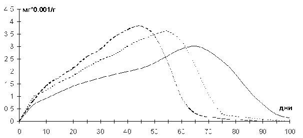 Существенными показателями являются также увеличение массы растения и площади листьев. На графиках рис. 2 и 3 отражен среднесуточный прирост сырой и сухой массы георгины. Как следует из графиков, изменение темпов увеличения массы также описывается одновершинной кривой. Вместе с тем, максимум среднесуточного прироста сырой и сухой массы приходится на конец фазы бутонизации и отстоит от максимального темпа роста растений в высоту на 15-20 дней.