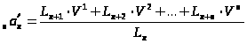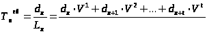 d>х>, d>x>>+1>, d>x>>+2>,..., d>x>>+t-1> - число вмираючих за строками страхування у роках; V - множник (дисконт).
