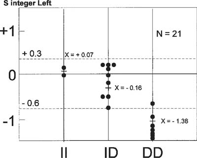 II; ID и DD - генотипы АПФ, по ординате - энергетические уровни ВЭЭП по LS integr. Позиции испытуемых обозначены точками, n = 21. Зона нормальной биоэнергетики (от +0,3 до -0,6) обозначена пунктирными линиями