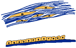 Рис. 2. Схема взаимоотношений между клетками (светло-коричневый цвет) и волокнами матрикса (синий цвет) в нормальной соединительной и эпителиальной ткани