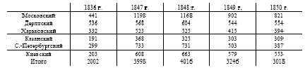В 1809 году появился указ, предписывавший желающим получить чин коллежского асессора сдавать экзамен в университете, но и это и ряд иных преобразований не привели к развитию системы высшего образования в России в этот период. В 1828 году, в период царствования Николая I, был создан комитет устройства учебных заведений, который имел своей целью ввести единообразие в системе образования, стандартизацию программ и учебных материалов. В том же 1828 году была проведена реформа уставов учебных заведений. Вводилась плата за обучение в гимназиях. При Николае I в 1834 году был открыт технический институт в Петербурге и университет Святого Владимира в Киеве. Одновременно при Николае I проявились и негативные тенденции в развитии высшей школы и образования. В 1835 году введено новое положение об управлении образовательными округами. В результате университеты перестали управлять гимназиями, а гимназии низшими школами. В 1835 году был принят новый устав университетов, фактически отменивший все академические свободы. Студентам было предписано носить специальную форму одежды. В 1844 году из учебных программ гимназий была изъята философия и общественные науки. В 1849 году должность ректора перестала быть выборной. Министру предоставлялось право назначать деканов факультетов. В 1850 году деканам факультетов предписывалось наблюдать за содержанием учебных программ каждого профессора, чтобы изъять из них все, что не соотносится с учением православной церкви и государственными положениями. Так, в 1850 году из перечня предметов университетов, как «бесполезная», была изъята философия. Увеличена плата за слушание лекций. В 1948 году был установлен предел для числа студентов в каждом университете в 300 человек. Тем самым подчеркивалось, что дети благородных семей должны предпочесть военную службу службе гражданской. Динамика изменения числа студентов в университетах России к 1850 году представлена в таблице [4].