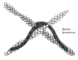 Вспомогательные белки филамин и -актинин выполняют функции своеобразных скобок, сшивающих филаменты актина в структуру, напоминающую рыболовную сеть (рис. 14). Белок фибрин связывает актиновые филаменты в толстый пучок вроде веника или снопа. Тропомиозин стабилизирует уже сформированные тяжи актина (рис. 7). Гельзолин действует словно секатор, разрезая длинные филаменты на отдельные кусочки. Профилин, как нянька, сопровождает актиновые глобулы к местам их присоединения к образовавшимся ранее фрагментам нитей, виллин служит инициатором полимеризации актина в растворе, а тимозин, наоборот, не позволяет глобулярному актину соединятся в нити. Наконец, миозин способен активно подтягивать филаменты навстречу друг другу (рис. 5). Таким образом актиновые филаменты можно уподобить арматуре строительных лесов, которые можно резать, надставлять и соединять под любыми углами и в любых положениях. Их можно также соединять вместе, создавая тянущее напряжение всей конструкции.