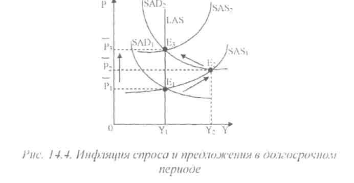 В случае инфляции спроса в краткосрочном периоде, кривая совокупного спроса сдвигается вправо вверх (из положения SAD1 в положение SAD2). Новое рыночное равновесие устанавливается в точке Е2 (вместо E1). На увеличение закупок продавцы ответят повышением цен и постепенным расширением производства. Увеличившийся спрос на производственные ресурсы со стороны продавцов готовой продукции вызовет рост цен, как на ресурсы, так и на готовую продукцию, с помощью которых она производится. Инфляция спроса переходит в инфляцию предложения. Из-за роста цен происходит сокращение количества покупателей и, как следствие, - совокупного предложения. Это выражается в сдвиге кривой совокупного предложения влево вверх (из положения SAS1 в положение SAS2). Новое рыночное равновесие устанавливается в точке Е3 (вместо Е2). Процесс повторяется, как только происходит увеличение совокупных доходов и, соответственно, расходов покупателей. Инфляция предложения трансформируется в инфляцию спроса и т.д.