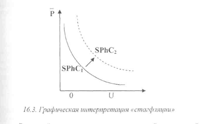 В данной ситуации каждая точка новой пунктирной краткосрочной кривой Филлипса (SPhC2) отражает более высокий уровень инфляции и безработицы по сравнению со сплошной кривой (SPhC1|).
