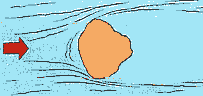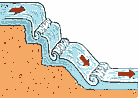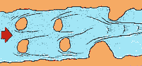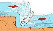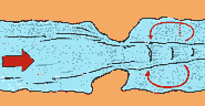 Поток воды, образующийся в центре узости, называется "ЯЗЫК". По сторонам языка образуются зоны обратного тока воды (красные стрелки) называемые "СБОЙКА" |
