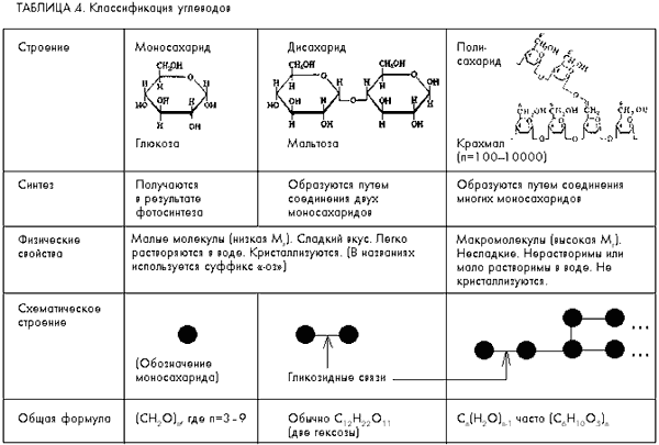 Углеводы являются основным питательным и опорным материалом растительных клеток и тканей. В молекулах большинства углеводов водород и кислород присутствуют в том же соотношении, что и в молекуле воды (например, глюкоза С6Н12О6 или С6(Н2О)6). Все углеводы – полифункциональные соединения. К ним относятся моносахариды – полигидроксиальдегиды (альдозы), полигидроксикетоны (кетозы) и полисахариды (крахмал, целлюлоза и др.) (см. табл.4).
