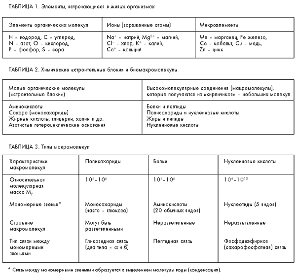 В земной коре встречается около 100 химических элементов, но для жизни необходимы только 16 из них (табл. 1). Наиболее распространены в живых организмах четыре элемента: водород, углерод, кислород и азот. На их долю приходится более 99% как массы, так и числа атомов, входящих в состав всех живых организмов.