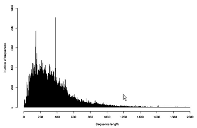 Рис. 9. Распределение транслированных аминокислотных последовательностей по числу минокислотных остатков