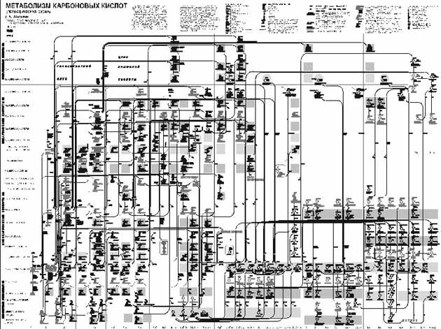 Одним из первых успехов на этом пути является создание карты метаболизма карбоновых кислот в Институте биохимии им. А.Н. Баха Российской академии наук (рис. 17). Эта карта представляет собой сеть реакций с регулярным периодическим строением. Такой подход оказался успешным ввиду того, что функционально аналогичные метаболиты претерпевают сходные биохимические превращения, образуя функционально аналогичные производные. В карте по вертикали расположены области, содержащие соединения с одинаковым числом атомов углерода (от 1 до 10), а горизонтальные ряды представляют собой ряды функционально аналогичных метаболитов. Химические структуры на карте соединены многочисленными стрелками с указанием, какие ферменты (белки) участвуют в соответствующих химических превращениях. Не правда ли, такой подход напоминает периодическую систему химических элементов Д.И. Менделеева? И так же, как и менделеевская система, данная карта обладает прогностической силой. С ее помощью был предсказан целый ряд новых ферментов, которые впоследствии были обнаружены экспериментально.
