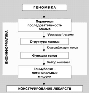Рис. 18. Взаимосвязь геномики, протеомики и биоинформатики при решении проблемы конструирования новых лекарственных средств