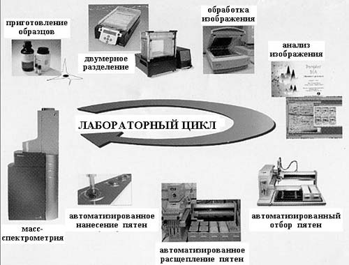 На рис. 2 приведена схема лабораторного цикла от приготовления образца до определения его структуры. После выделения и очистки (на рисунке представлен уже выделенный и очищенный препарат) с помощью двумерного электрофореза проводится разделение белков. Это разделение идет по двум направлениям: в одном разделяются молекулы белка, имеющие разную массу, в другом – различный суммарный электрический заряд. В результате этой тончайшей процедуры на специальном носителе одинаковые молекулы группируются, образуя макроскопические пятна, причем в каждом пятне содержатся только одинаковые молекулы. Число пятен, т.е. число разных белков или пептидов, может составлять многие тысячи (рис. 3, 4), и для их исследования используются автоматические устройства для обработки и анализа. Затем проводится отбор пятен и введение содержащихся в них веществ в сложнейший физический прибор – масс-спектрометр, с помощью которого и определяется химическая (первичная) структура каждого белка.