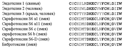 Рис. 14. Первичные структуры структурно-гомологичного семейства эндотелинов / токсинов