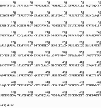 Рис. 6. Аминокислотная последовательность предшественника сывороточного альбумина человека, транслированная с нуклеотидной последовательности с помощью генетического кода