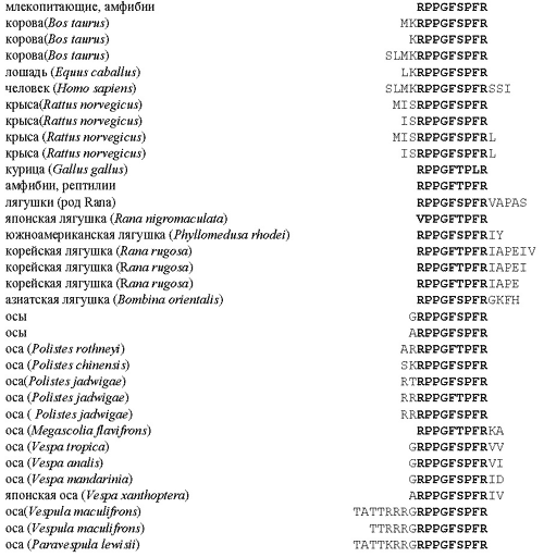 Рис. 13. Первичные структуры природных пептидов брадикининов, полученных из разных живых организмов. Жирным шрифтом указаны квазиконсервативные области