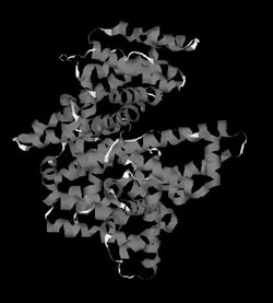 Однако аминокислотная последовательность не раскрывает пространственную структуру белка. С точки зрения термодинамики, вытянутая линейная структура энергетически невыгодна, и поэтому она специфическим для каждой последовательности образом сворачивается в уникальную пространственную структуру, которая может быть определена с помощью двух мощных физических методов – рентгеноструктурного анализа и метода ядерного магнитного резонанса (ЯМР-спектроскопии). С помощью первого из них определены пространственные структуры уже нескольких тысяч белков, в том числе и сывороточного альбумина человека, изображение которого представлено на рис. 7. Эта структура, в отличие от первичной (аминокислотной последовательности), называется третичной и в ней хорошо видны спирализованные участки, являющиеся элементами вторичной структуры.