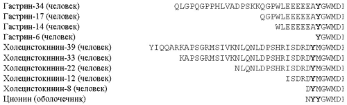 На рис. 11 показаны представители протеома (в данном случае пептидома) человека – различные гастрины и холецистокинины, которые локализованы в желудочно-кишечном тракте (при написании аминокислотных последовательностей использован стандартный однобуквенный код, расшифровка которого была дана нами ранее [7]). Функциональными частями молекул этих пептидов являются очень схожие правые области. Однако пептиды обладают прямо противоположными поведенческими свойствами: гастрины вызывают у человека ощущение голода, а холецистокинины – сытости. По-видимому, данное различие обусловлено тем, что в первичной последовательности холецистокининов положение остатка тирозина Y сдвинуто на один шаг по сравнению с гастринами. На том же рисунке приведена первичная структура пептида ционина, полученного из представителя простейших хордовых Ciona intestinalis (рис. 12). Его структура гомологична и гастринам, и холецистокининам и характеризуется двумя остатками тирозина, находящимися в тех же положениях, что и у обоих указанных пептидов. К сожалению, функциональные свойства его не изучены. А при должном экспериментальном исследовании можно было бы ответить на вопрос, какова роль химической структуры в целом и остатков тирозина в частности при проявлении противоположных физиологических эффектов.