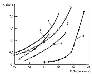 Разработаны технологии приготовления и использования угольных суспензий на основе нефти, метанола и воды. Наиболее перспективными принято считать ВУС или ВУТ. Очевидным недостатком ВУС является большое содержание в них воды — до 40 % состава, причем этот показатель невозможно заметно уменьшить из-за катастрофического роста вязкости с повышением содержания угля (рис. 1).