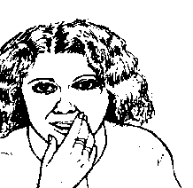 Когда взрослый человек лжет, его мозг посылает ему импульс прикрыть рот, в попытке задержать слова обмана, как это делается пятилетним ребенком или подростком, но в последний момент рука уклоняется ото рта и рождается другой жест – прикосновение к носу (рис.6). Такой жест есть ни что иное, как усовершенствованный взрослый вариант того же жеста прикрывания рта рукой, который присутствовал в детстве.