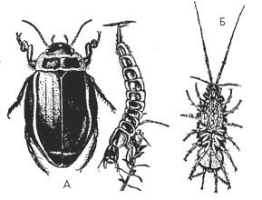 А – плавунец широкий и его личинка; Б – самка водяного ослика с выводковой камерой