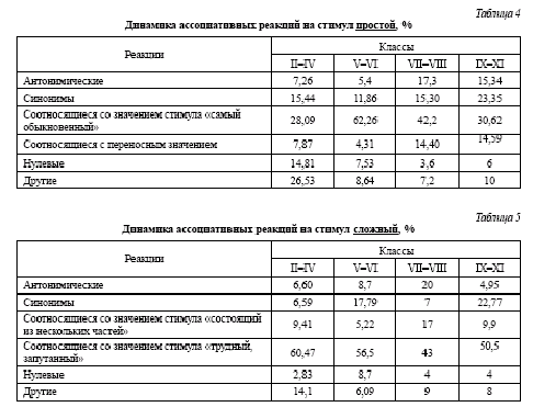 Составленные таблицы (1–5) демонстрируют динамику изменения доли реакций-антонимов и реакций-синонимов. Эти изменения происходят по-разному, поскольку динамика связана со значением исследуемых стимулов.