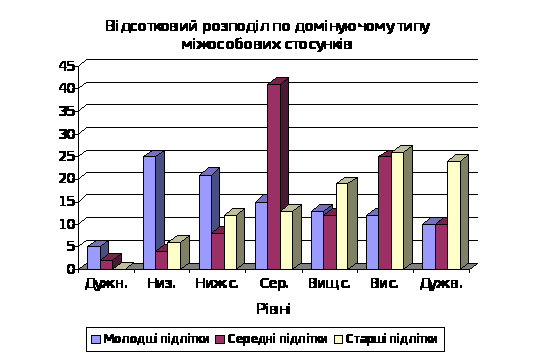 В результаті аналізу дослідження типів міжособових стосунків встановлено, що тип домінування є найбільш вираженим у старшому підлітковому віці, де він знаходиться на високому рівні; у середніх підлітків більш виражений середній рівень типу домінування; у молодших підлітків цей тип розвинений на низькому рівні. Це свідчить про те, що в молодшому підлітковому віці ще не виражені навички домінуючого типу поведінки. Цей тип міжособових стосунків починає проявлятися в середньому підлітковому віці, коли виникає почуття незалежності від оточуючих, зростає прагнення звернути увагу на свою індивідуальність. Більш чітко позиція домінування виражена у старшому підлітковому віці. Прагнення до почуття дорослості досягає своєї вершини й підлітки намагаються проявити себе шляхом домінування, маючи при цьому свій індивідуальний стиль (імідж) поведінки.