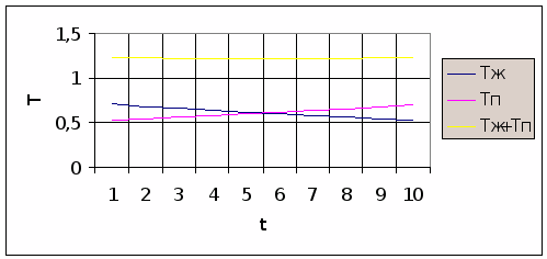 Исходя из динамики трудозатрат, различают 2 возможных варианта развития технологического процесса – ограниченное и неограниченное . Построим график изменения живого и прошлого труда для определения варианта развития техпроцесса. Наши исходные данные : Тж=500/(27t+675) и Тп=0,02t +0.5: